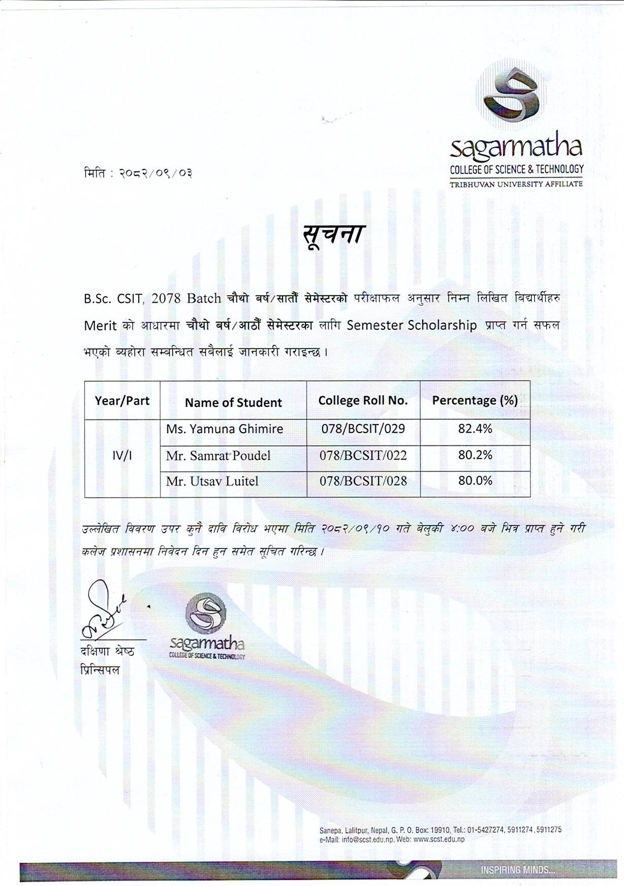 Notice Regarding Semester Scholarship for B.Sc. CSIT 2078 Batch